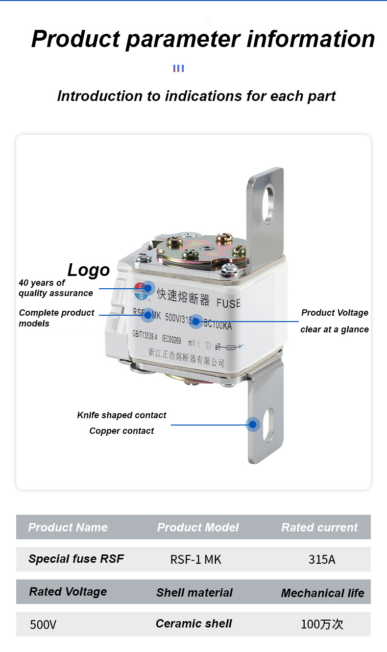 500V névleges feszültséggel és 315A névleges árammal rendelkezik, amely hatékonyan tudja biztosítani az elektromos biztonságot, megelőzni a túlterhelést és a rövidzárlatot. Az RSF-1K 500V-315A BC100KA biztosíték Linkek