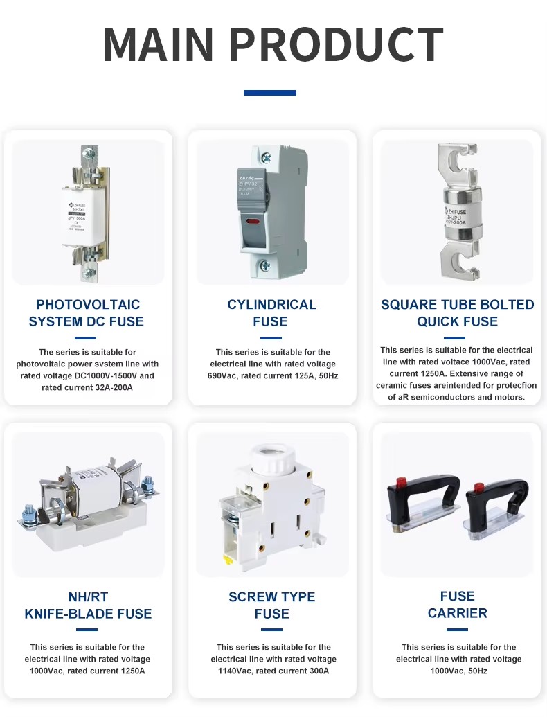 A ZHPV-125 1000V DC biztosítékalap és a biztosítékkapcsolatok szerkezeti jellemzői a 22 × 58 mm-es hengeres kerámia biztosíték alsó részén a fotovoltaikus rendszerben a következők. Ez a biztosítékok sorozata egy biztosítékkapcsolatból és egy biztosítéktulajdonosból áll. A tiszta rézlemezből (vagy rézhuzalból, ezüst huzalból, ezüst lemezből) készült változó keresztmetszeti biztosítéktest egy nagy szilárdságú kerámia vagy epoxi üvegszövetből készült biztosítékcsövben, kémiailag kezelt, nagy puritási kvarc homokkal töltve, íves oltó tápközegként. A biztosítékmag két oldalát megbízhatóan csatlakoztatják a véglemezhez a folthegesztés útján, hengeres sapkás alakú szerkezetet képezve. A ZHPV-125 1000 V DC biztosíték alapja gyantából vagy műanyag héjból készül, amely elektromos ütéssel van préselve, beleértve egy biztosíték elemet, amelyet a szegecselés a megfelelő méretű biztosíték testkomponensének támogatásával csatlakoztat. Ennek a biztosítéksorozatnak a kis mennyiség, a könnyű telepítés, a biztonságos használat és a gyönyörű megjelenés előnyei vannak.